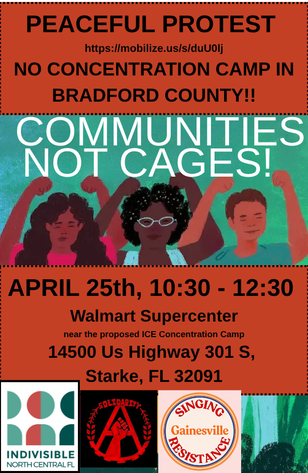 ✅ Saturday 4/25 at 10:30 am: Protest at the Super Walmart in Starke for a nationwide day of action against detention centers.